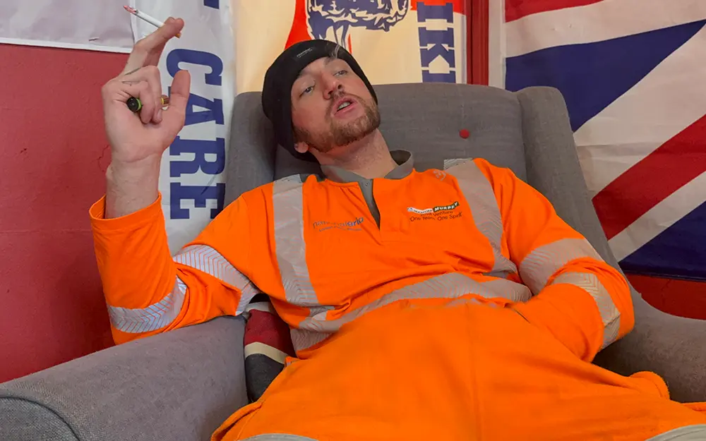 Jay’s that perfect mix of street lad and sexed-up brute — fit, toned, covered in ink, and swaggering about like he owns the gaff. One minute he’s lounging back in his high-vis with a cig hanging off his lip, the next he’s in full attack mode, taking control of the room like he’s been waiting all week for the action.