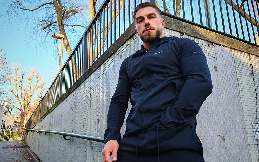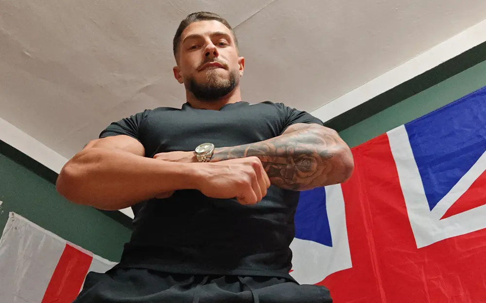 There’s something unapologetically solid about him. No flash. No wasted motion. Whether he’s leaning back, arms folded, or standing there letting the camera come to him, he looks like a bloke who’s comfortable being in control. That tight black tee doesn’t hide much either — built strong, balanced, and powerful in that very London way.