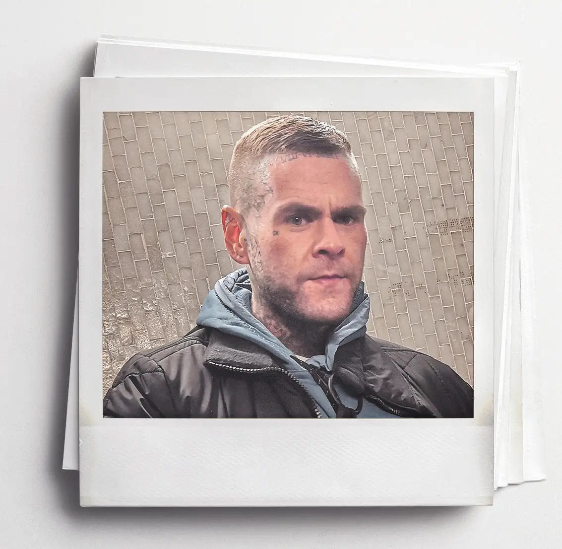 No polish. No mercy. Just a proper rough-as-fuck British beast stepping out of the shadows like he owns the night. Shaved head, face tats crawling up the sides, thick neck swallowed by ink, cold stare that says “try me.” Built like a fucking tank — wide shoulders, heavy chest, arms thick with real graft muscle, all wrapped in that black puffer and hoodie like he’s ready to scrap or smash at a moment’s notice. This isn’t some gym pretty boy. Dirty Harry is estate-hardened, brutal energy: scarred knuckles, gold chains, that low growl in his voice when he finally speaks. Drops the layers and unleashes a thick, heavy uncut cock — veiny monster meat swinging low, built to ruin holes without apology.