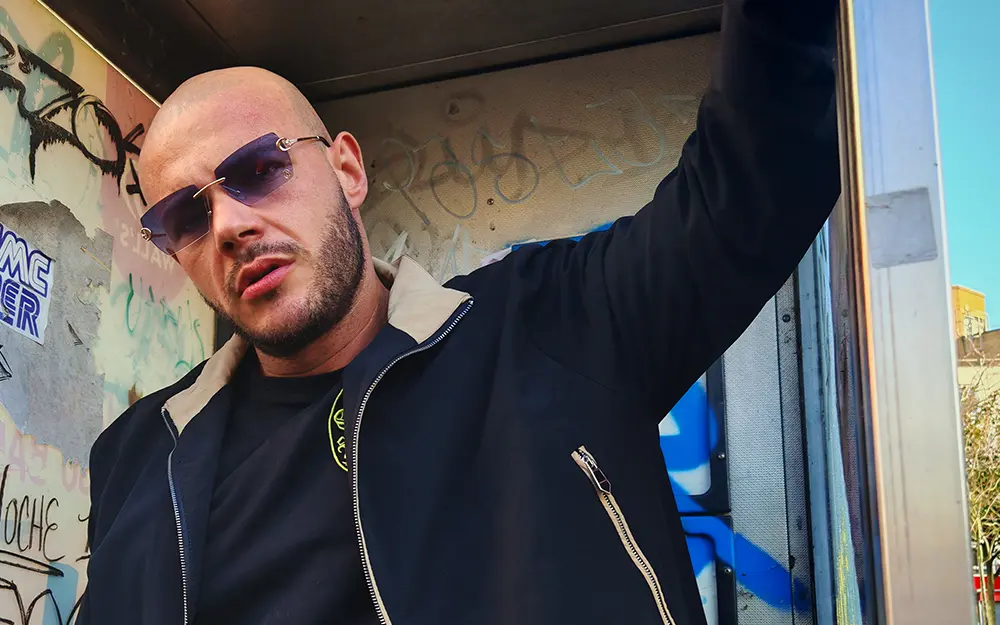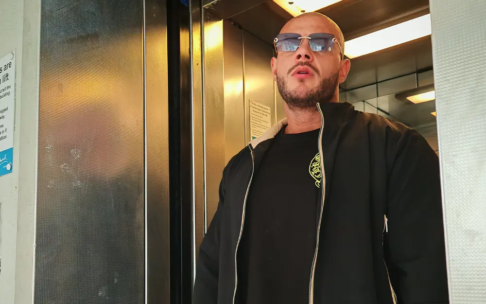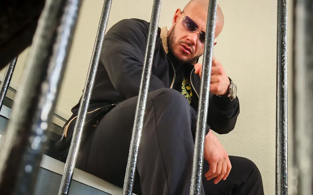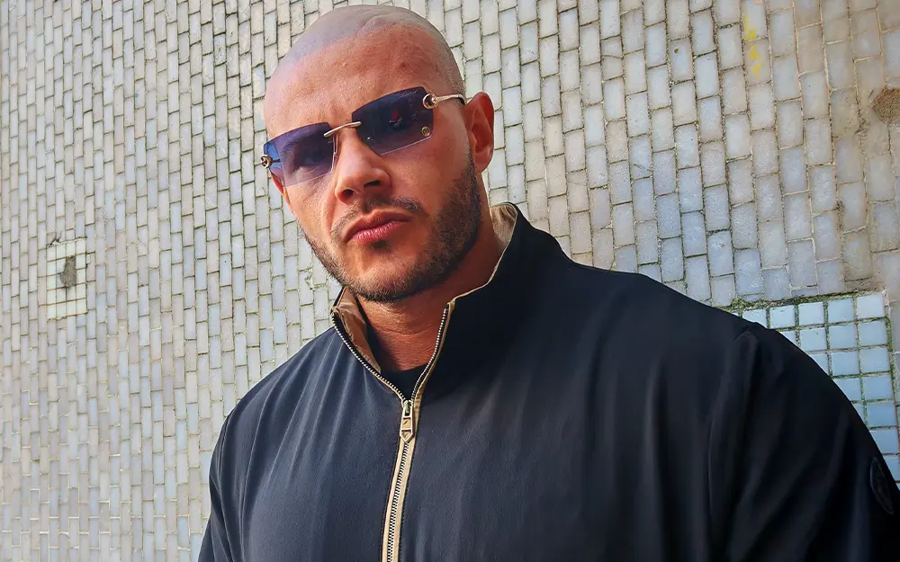 Shaved head catching every light like polished steel, gold-rimmed shades low enough to hide the trouble in his eyes, thick chain resting heavy on a chest that looks carved from granite. No face ink, but the rest of him is a walking canvas. This lad’s built like he spends his days shifting breeze blocks and his nights shifting egos.